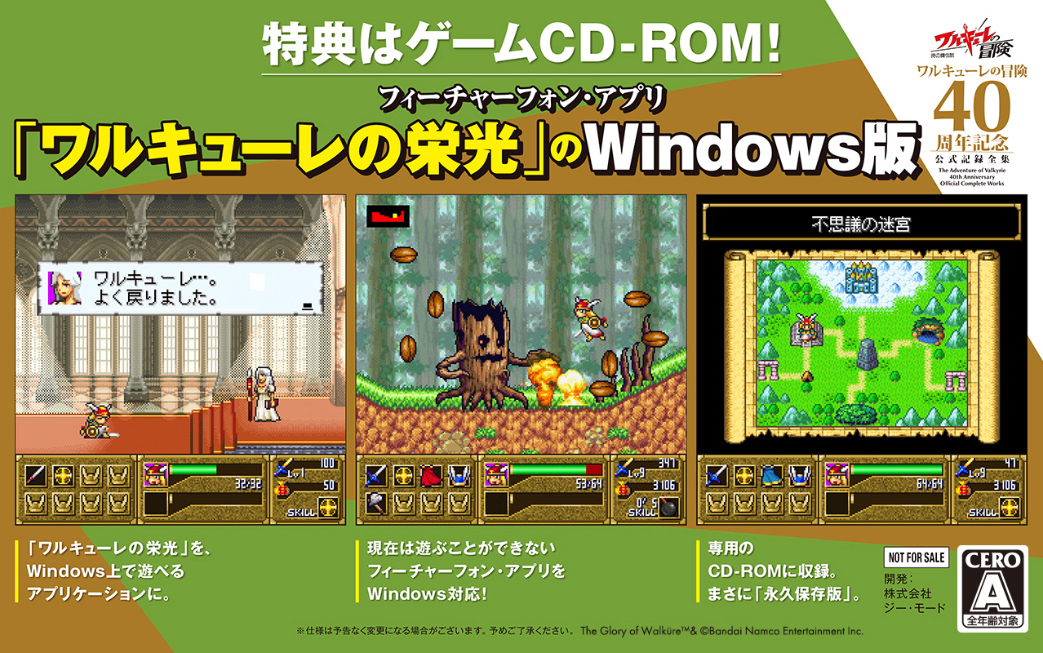 2007年にフィーチャーフォン用アプリとしてリリースされた「ワルキューレの栄光」は、シリーズの世界観を受け継いだ横スクロール型のアクションゲーム。携帯各社のフィーチャーフォンで配信されていたゲームであるが、現在はサービスが終了していてプレイすることができない。今回、シリーズの40周年記念として「ワルキューレの栄光」を、Windows上で遊べるアプリケーションとして初移植。これらは専用のCD-ROMに収めてお届けする。配信アプリであるがゆえに、現在は遊ぶことができなかったこれらのゲームだが、いずれも永久保存版として手元に残しておくことができる仕様だ。