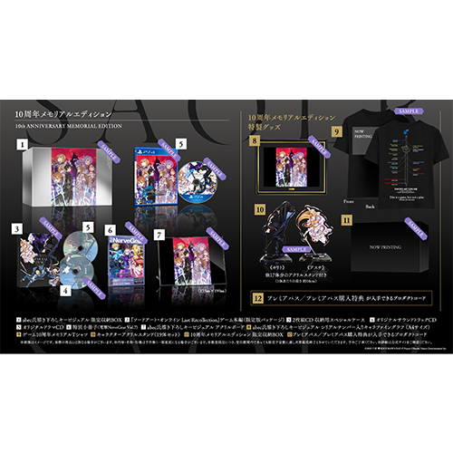| 10周年メモリアルエディション内容 | ■「ソードアート・オンライン ラスト リコレクション」Last Recollection Edition(ゲーム本編含む全7アイテム) ■10周年メモリアルエディション 限定収納BOX ■abec氏描き下ろしキービジュアル シリアルナンバー入りキャラファイングラフ(A4サイズ) ■キャラクターアクリルスタンド(19体セット) ■ゲーム10周年メモリアルTシャツ ■プレミアパス/プレミアパス購入特典/歴代SAOゲームシリーズバトルBGMパックが入手できるプロダクトコード ・プレミアパス:「追加ヒロインコンテンツ①」「追加ヒロインコンテンツ②」 ・プレミアパス購入特典:追加衣装「整合騎士キリト」「整合騎士ユージオ」 ・歴代SAOゲームシリーズバトルBGMパック |