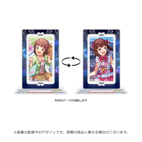 中央のイラスト部分が回転し、ミリシタカードの覚醒前と覚醒後のイラストが楽しめます!
