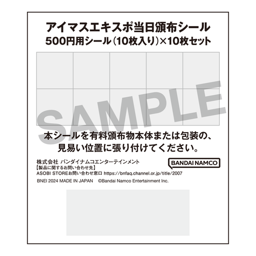 トップ > > アイマスエキスポ当日頒布シール > アイマスエキスポ当日頒布シール 500円用シール(10枚入り)×10セット
