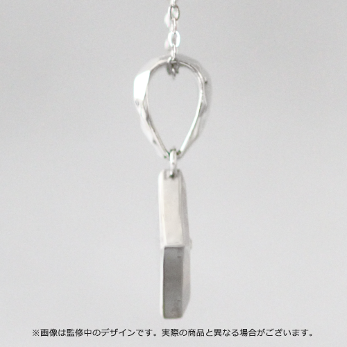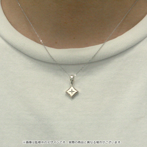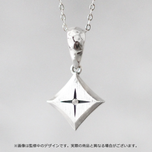 ネックレスは、光の輝きを表現したトップ部分にはヘアライン加工、バチカン部分にはスケールカット技法を用いることで直線と曲線を融合させたデザインがポイント。