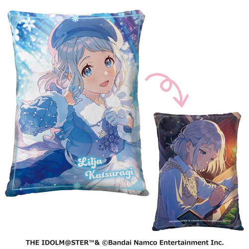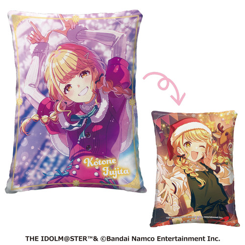 藤田ことね、葛城リーリヤ、花海佑芽のイベントカード素材を使用したクッションとラムネ菓子のセットです。