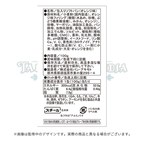 | 商品仕様 | 内容物:缶入りソフトパン 内容量:100g フレーバー:オレンジ味 |