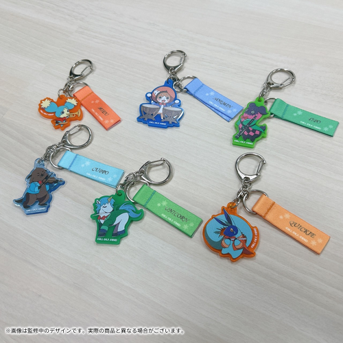楽器を持ったマスコットたちの描きおろしイラストをあしらったリボン付きアクリルキーホルダーです。