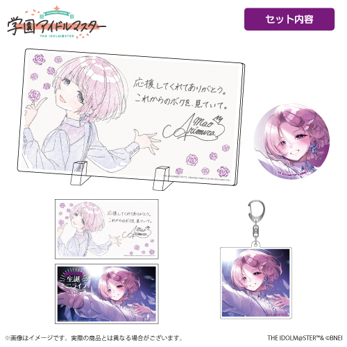 | セット内容 | スクエアアクリルパネル、スタンド缶バッジ、アクリルキーホルダー、ステッカー(2種) |