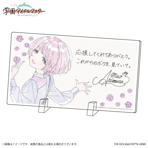 ・直筆風のコメントが入った飾れるスタンド付きアクリルパネル