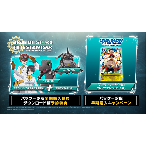 | 早期購入特典 | 早期購入特典 プレオーダーパック └育成デジモン「アグモン(黒)」「ガブモン(黒)」 └コスチューム「とある学校の制服」 └冒険アイテムセット 早期購入キャンペーン 「デジモンカードゲーム」プレイアブルカード(アイギオモン) |