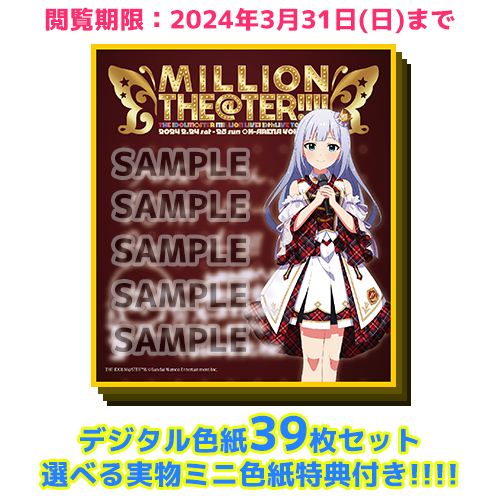 ※「THE IDOLM@STER MILLION LIVE! 10thLIVE TOUR 開催記念デジタル色紙 39種セット」をご購入いただいた方には、購入時に選択したアイドルの「実物特典ミニ色紙(※文字部分は印刷)」を後日お届けします。