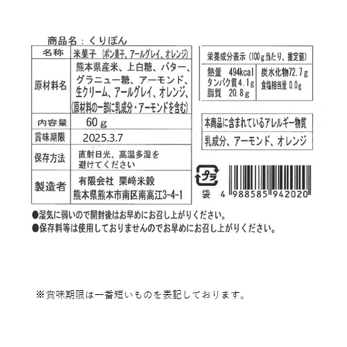 | 原材料名 | キャラメル:熊本県産米、上白糖、バター、グラニュー糖、アーモンド、生クリーム、海塩(天草産) 原材料の一部に乳成分、アーモンドを含む アレルギー:乳成分、アーモンド アールグレイ オレンジ:熊本県産米、上白糖、バター、グラニュー糖、アーモンド、生クリーム、アールグレイ、オレンジ 原材料の一部に乳成分、アーモンドを含む アレルギー:乳成分、アーモンド、オレンジ |