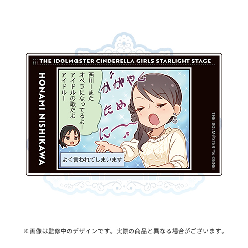 | 商品仕様 | 素材:アクリル サイズ:約W53×H85×t1mm ※全12種類のうち、クリアカードが1枚入っています。 ※「沖縄公演C」…涼宮星花、丹羽仁美 大石泉、瀬名詩織、多田李衣菜、西川保奈美、八神マキノ 喜多見柚、首藤葵、相馬夏美、並木芽衣子、龍崎薫 |