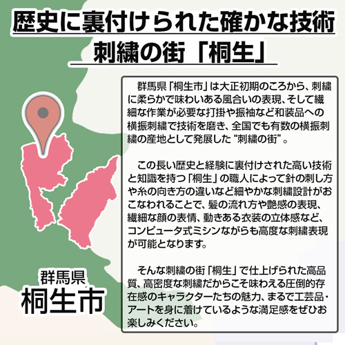 ・伝統的な刺繍の名産地「群馬県桐生市産」の高品質、高密度な仕上がりでキャラクターを精密に再現。